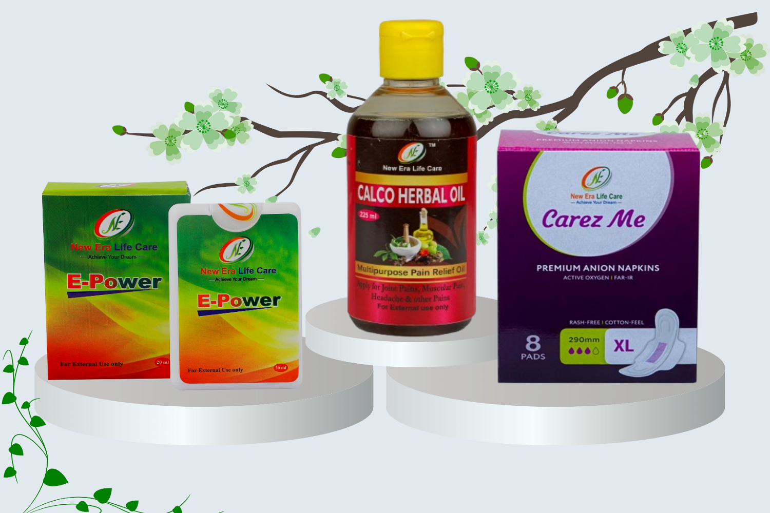 Experience complete wellness with our powerful trio—energy-boosting E-Power, pain-relieving Calco Herbal Oil, and ultra-comfort Carze Me sanitary napkins. Your daily health, comfort, and care—elevated.